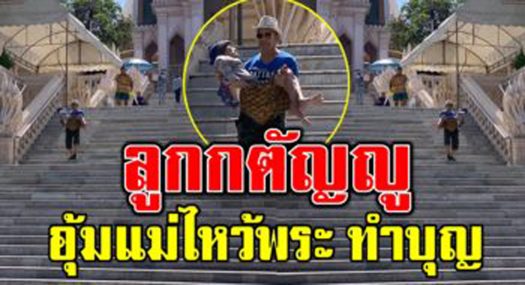 โดยคุณลูกได้พาคุณเเม่มาไหว้พระปฐมเจดีย์ ซึ่งต้องอุ้มขึ้นบันไดที่สูงเเละมีบันไดหลายขั้นมาก นี่ไม่ใช่ครั้งเเรกที่เขาอุ้มคุณเเม่ขึ้นมาไหว้พระปฐมเจดีย์ แอดมินเองก็ต้องขออนุโมทนากับลูกชายยอดกตัญญูผู้นี้ด้วยครับ